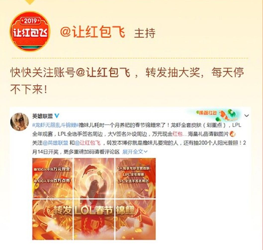 2月3日,微博宣布与2019年央视春晚达成视频及直播内容合作,双方将延续往年在视频及新媒体传播层面的深度合作,联手在春节期间推出央视春晚视频直播、相关节目集锦、幕后花絮以及亮点剪辑,除此之外微博还将上线花式拜年、趣味点评、打卡晒照等多样化的互动活动,丰富春节期间央视富媒体内容传播和视听感受,为全球华人带来最便捷、最有温度的新春跨屏体验。