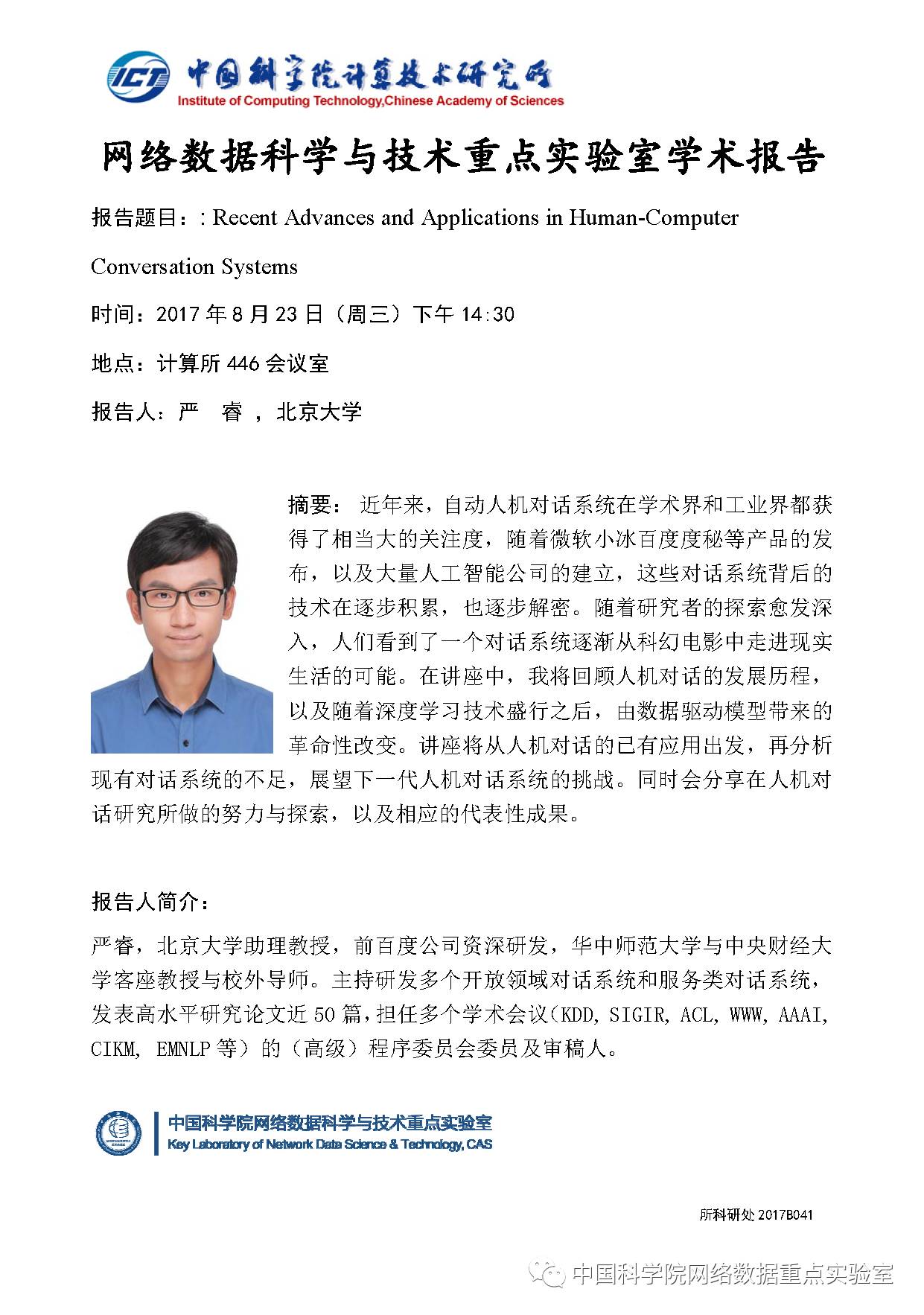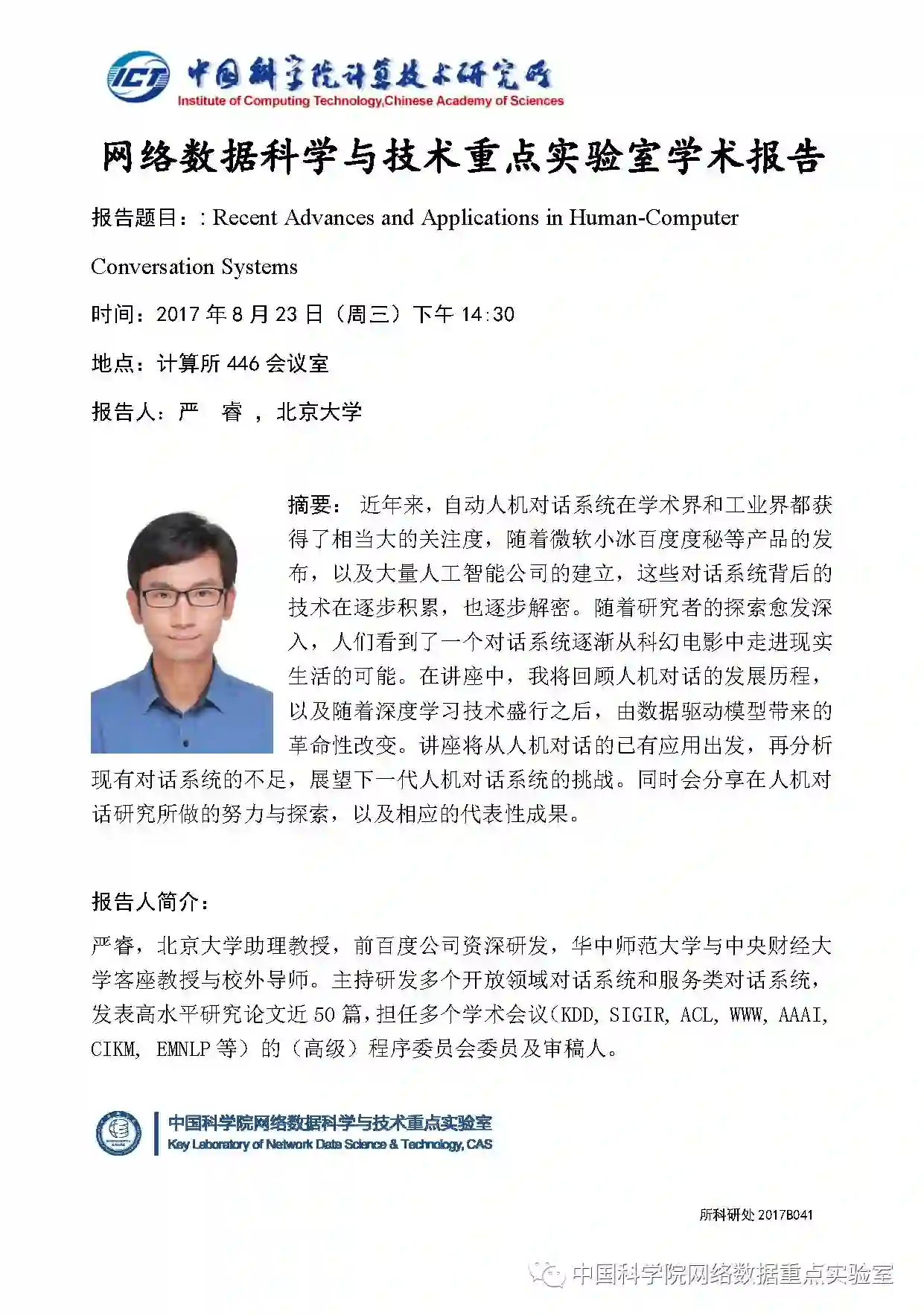 报告题目:: RecentAdvances and Applications in Human-Computer Conversation Systems