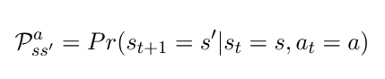 p 是转移概率(transition probability)。如果我们在状态 s 处开始,并实施动作 a,则会得到状态 s'和概率。