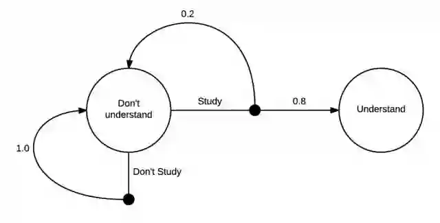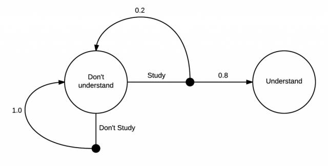 这一 MDP 展示了「学习」的马尔科夫决策过程。首先你在一个「不理解」的状态中,接着你面临着两个可能的动作(action)——学习或者不学习。如果你选择不学习,则有 100% 的可能性返回到不理解的状态里。然而,如果你选择学习,则可能性降低为 20%,即你有 80% 的可能性进入理解状态。