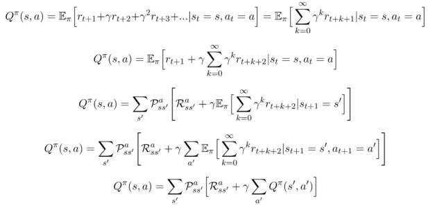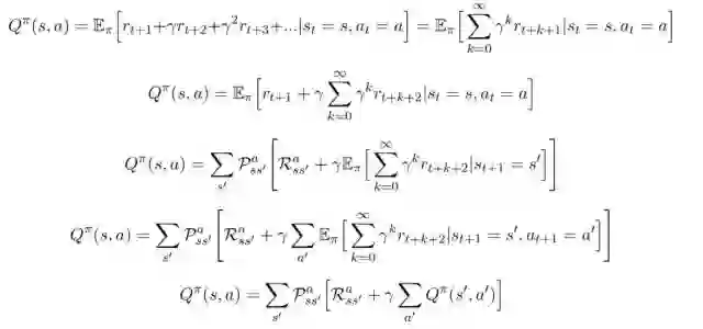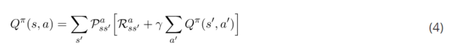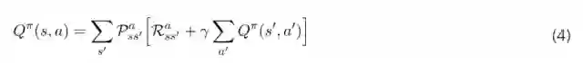 动作价值函数的贝尔曼方程可以用同样的方式进行推导。本文结尾有具体过程,其结果如下: