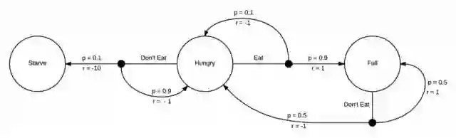 由于这个 MDP 很简单,我们很容易看到获取高奖励的方式就是呆在高奖励区域,即饿了就吃。在这一模型中当我们吃饱了就没有太多其他选择,但我们会不可避免地再次饥饿,并立即选择吃东西。强化学习感兴趣的问题具有更大更复杂的马尔科夫决策过程,并且通常在我们实际探索之前,无法获得这种策略的任何信息。
