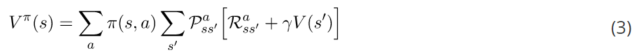 最后,了解了这些,我们就可以推导出贝尔曼方程了。我们认为贝尔曼方程是一个状态价值函数。使用回报的概念,我们将重写方程(1):