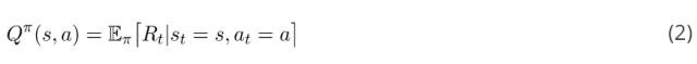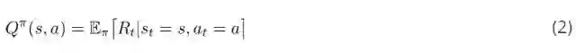 我们使用的另一个价值函数是动作价值函数。该函数告诉我们使用特定策略时某个状态中采取一个动作的值。在策略 π中,给定状态和动作情况下,期望回报为: