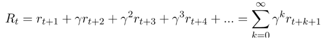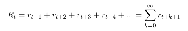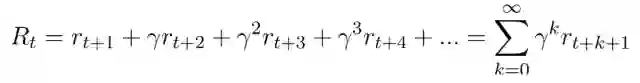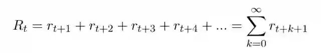 正如之前所讨论的,强化学习智能体需要学习最大化累积未来奖励(cumulative future reward)。描述累积未来奖励的术语是回报,通常用 R 表示,并对特定时间步的回报加上一个下标 t。使用数学符号表示为: