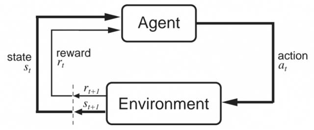 这张图片很好地解释了智能体和环境之间的互动。在某个时间步 t,智能体处于状态 s_t,采取动作 a_t。然后环境返回一个新的状态 s_t+1 和一个奖励 r_t+1。奖励处于时间步 t+1 的原因是它是由环境在 t+1 的状态 s_t+1 中返回的,因此令它们保持一致更加合理(如图中所示)。