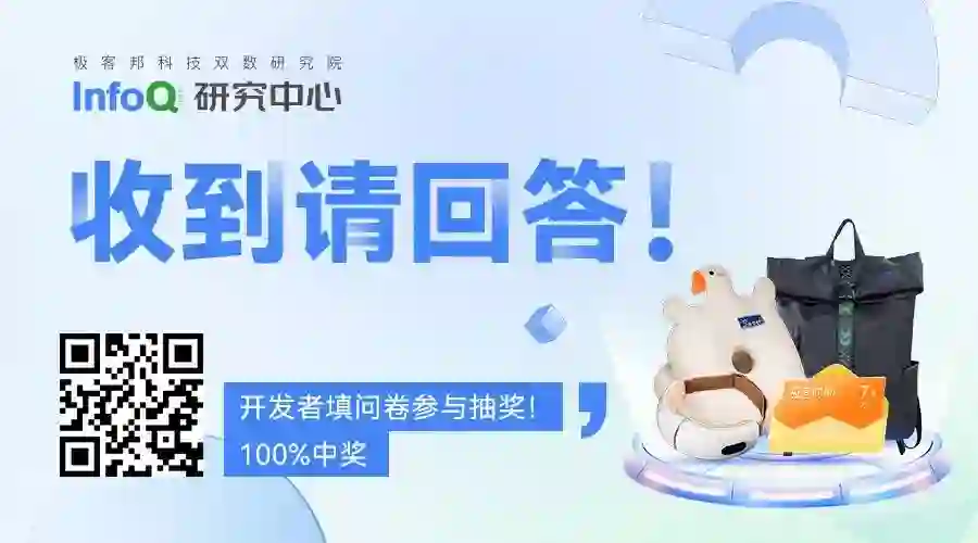 InfoQ 研究中心邀请正在看这篇文章的你,用填写问卷的方式,让我们可以更加深入了解当前开发者的现状,并且你也将获得一次 100% 中奖的抽奖机会。每一份问卷的提交,都会成为报告数据的有力支撑,帮助越来越多的开发人员不断学习,建立成长型思维,让开发者的能力与时俱进,为中国建设更好的开发者生态添砖加瓦!