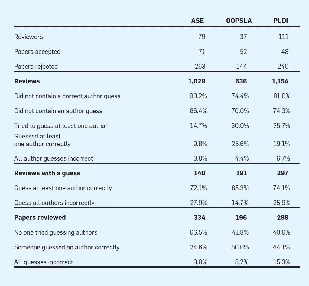 当评审者进行猜测的时候,他们很可能会猜对。其中,ASE 的猜测正确率是72%,OOPSLA是 85%,PLDI是74%。然而,大多数论文没有一个评审人猜对哪怕一个作者,而且大多数评审意见包含不正确的猜测(ASE 90%, OOPSLA 74%, PLDI 81%)。
