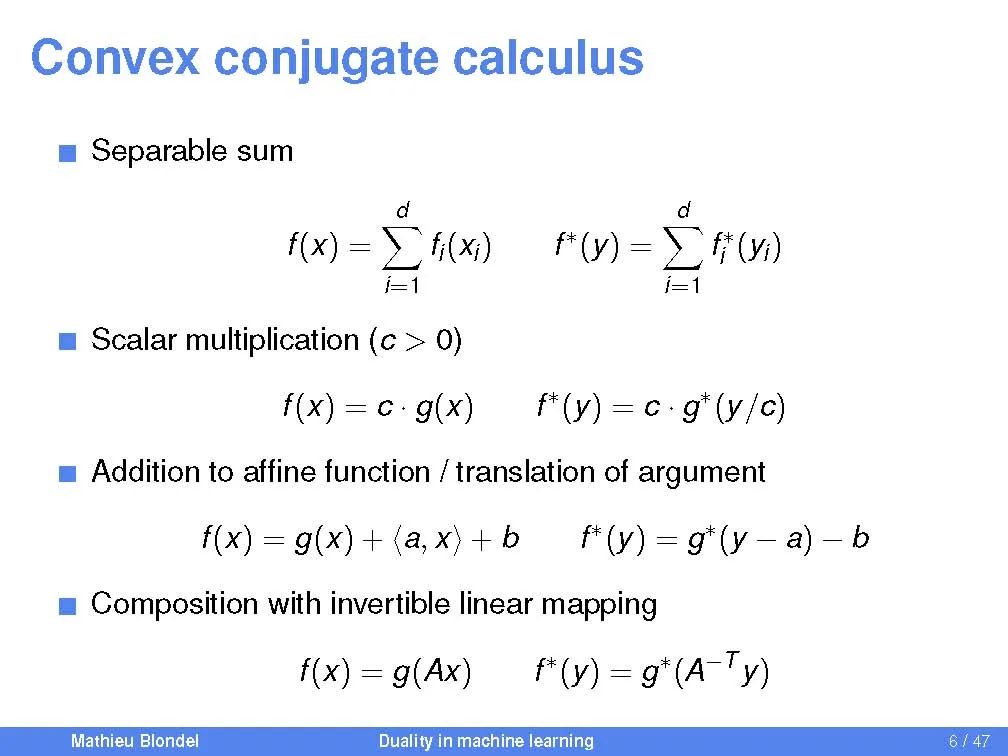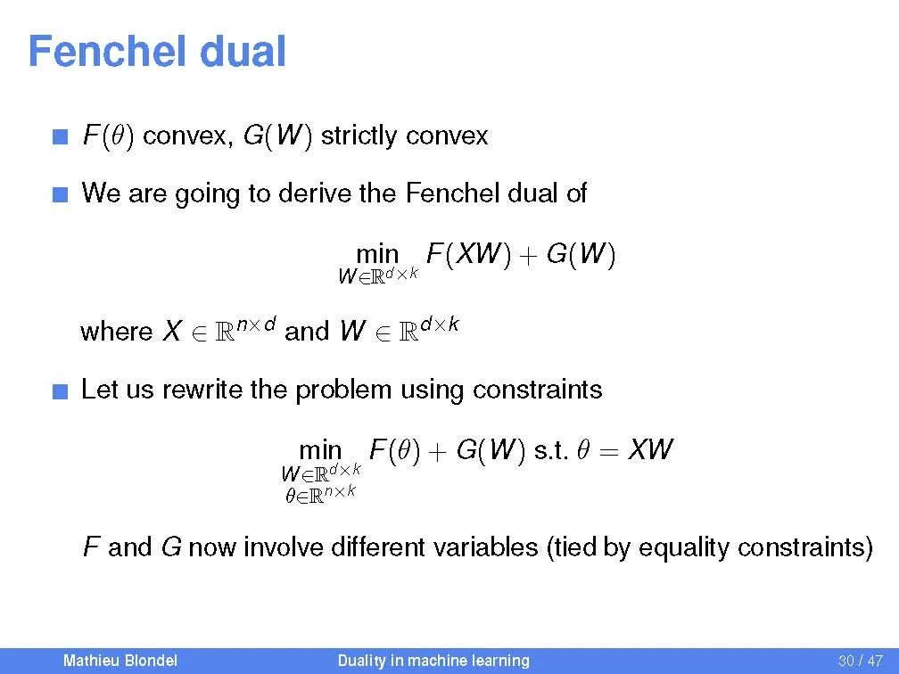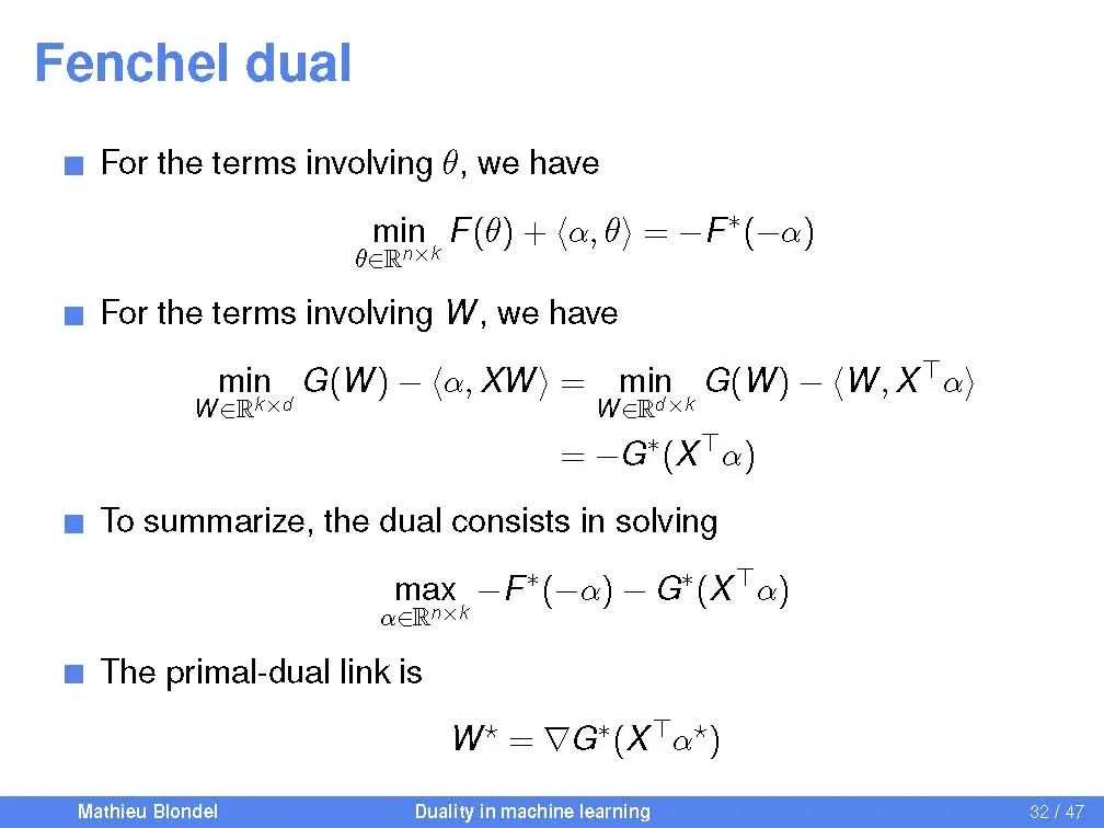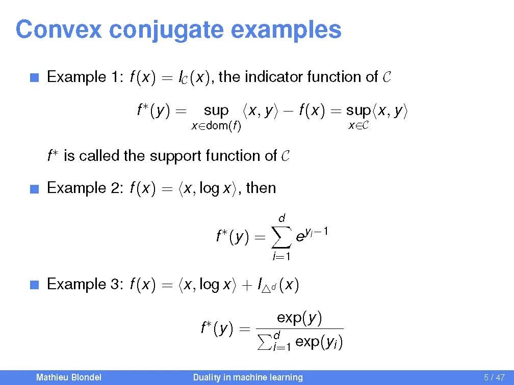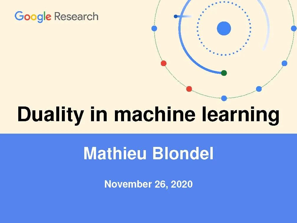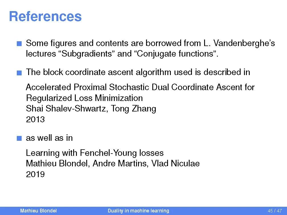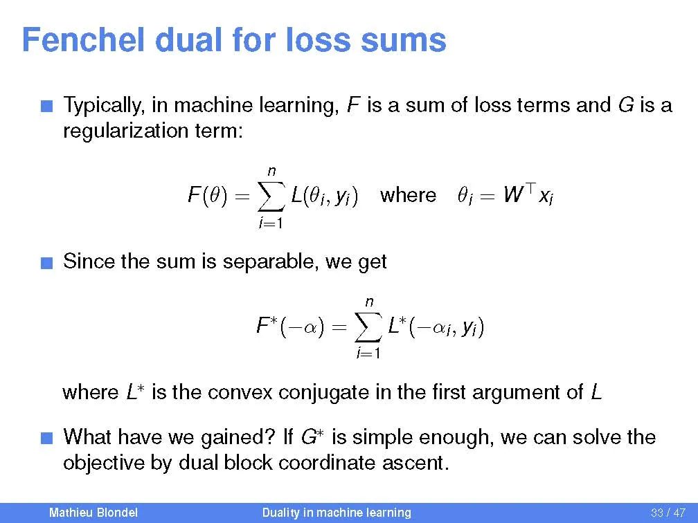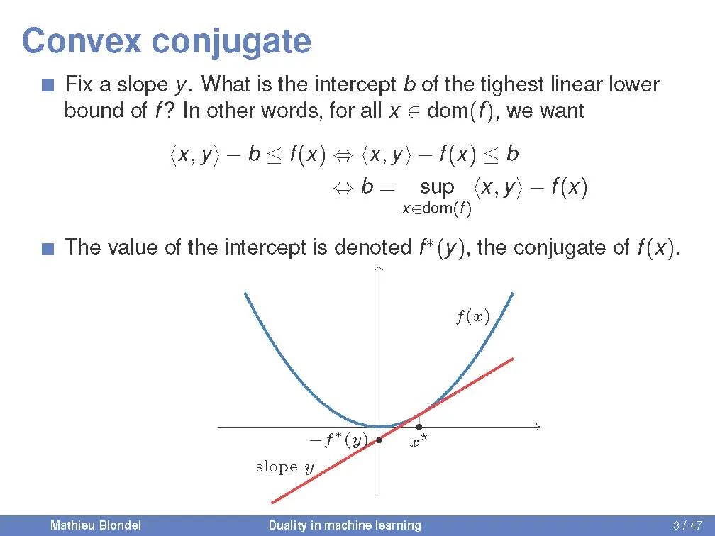 Google 研究科学家Mathieu Blondel在PSL大学的“机器学习的对偶性”课程材料。主题包括共轭函数,平滑技术,Fenchel对偶性,Fenchel-Young损失和块对偶坐标上升算法。