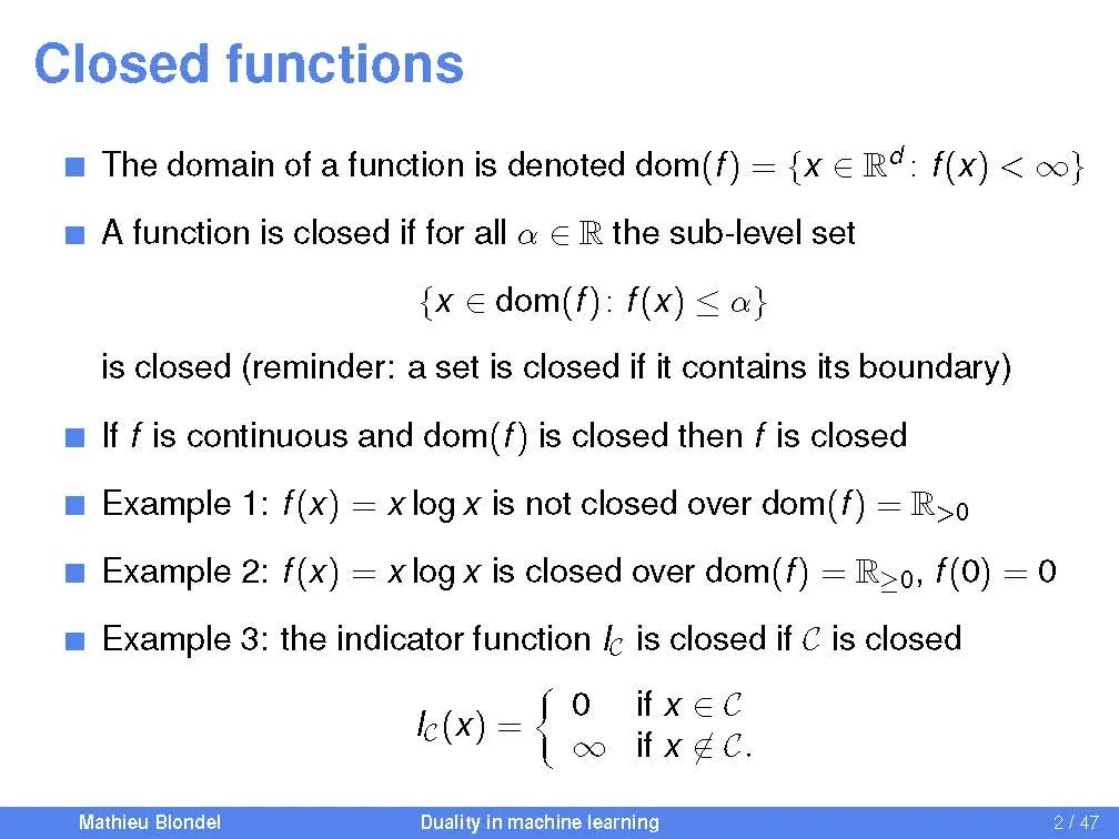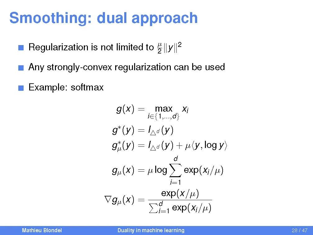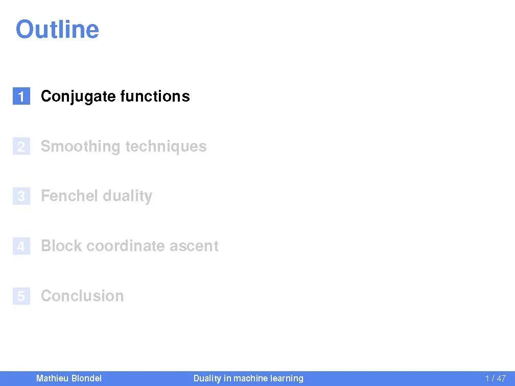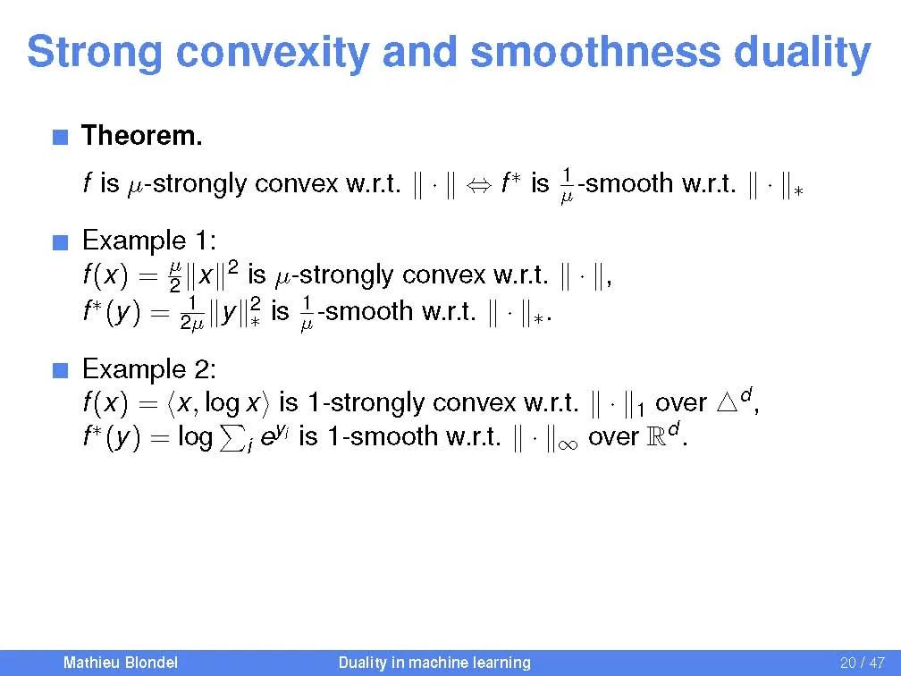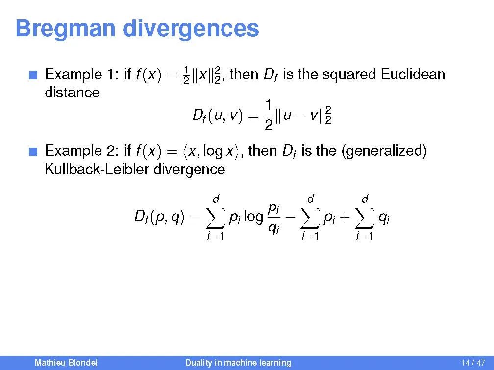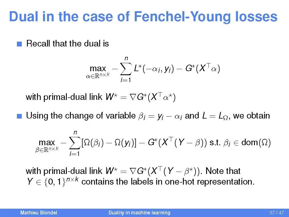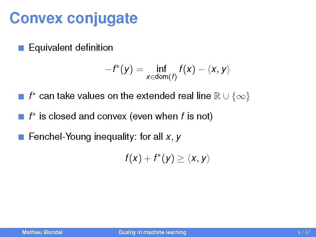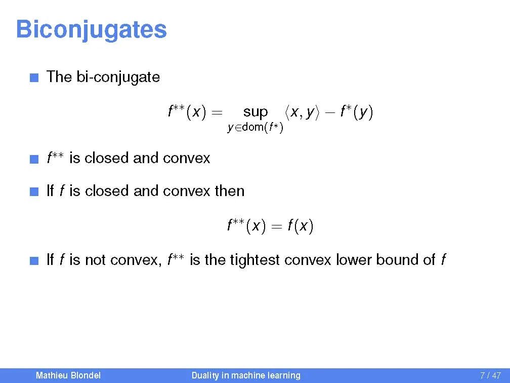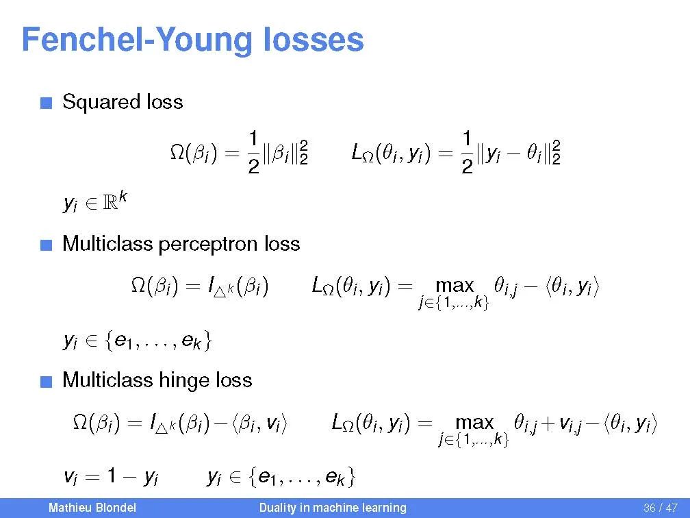 Google 研究科学家Mathieu Blondel在PSL大学的“机器学习的对偶性”课程材料。主题包括共轭函数,平滑技术,Fenchel对偶性,Fenchel-Young损失和块对偶坐标上升算法。