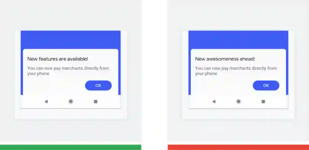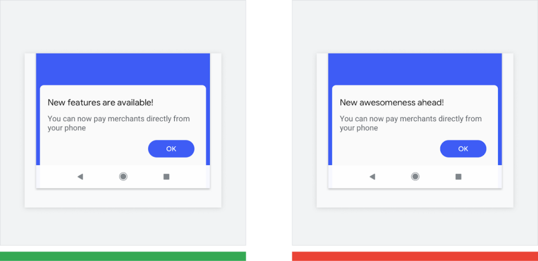 △ 正确做法 (绿色): "New features are available" (有新功能可用) 简洁明了。