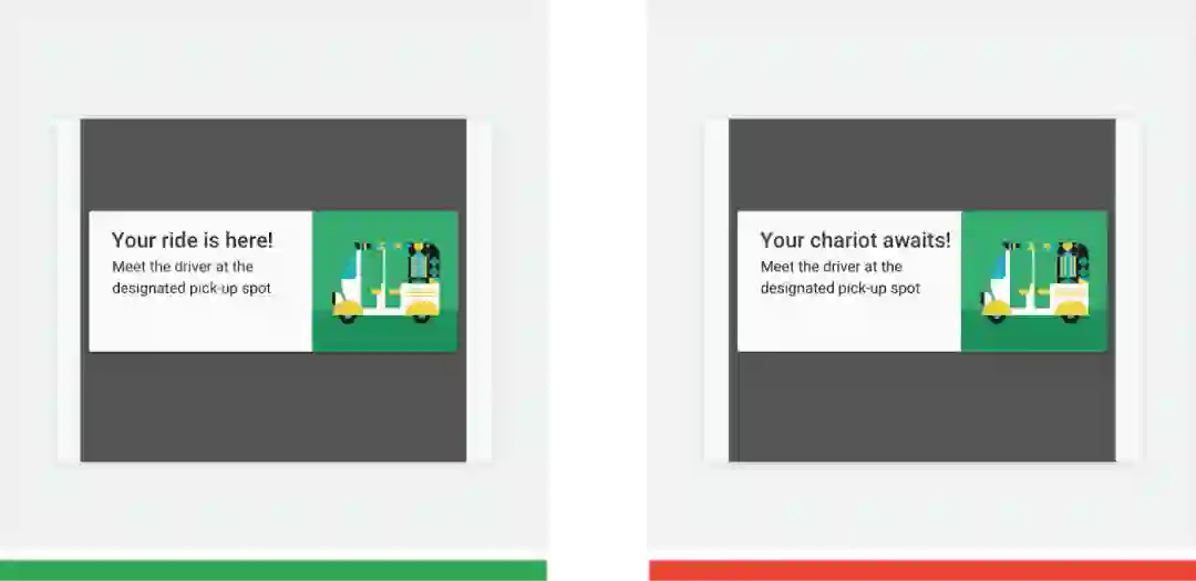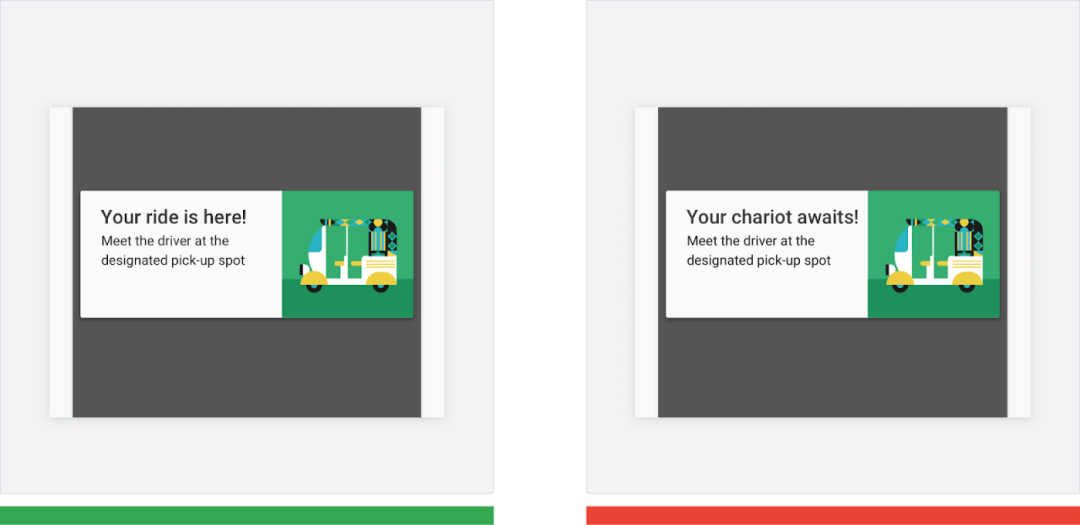 △ 正确做法 (绿色): "Your ride is here" (您呼叫的车已抵达) 很容易理解,也不难翻译。