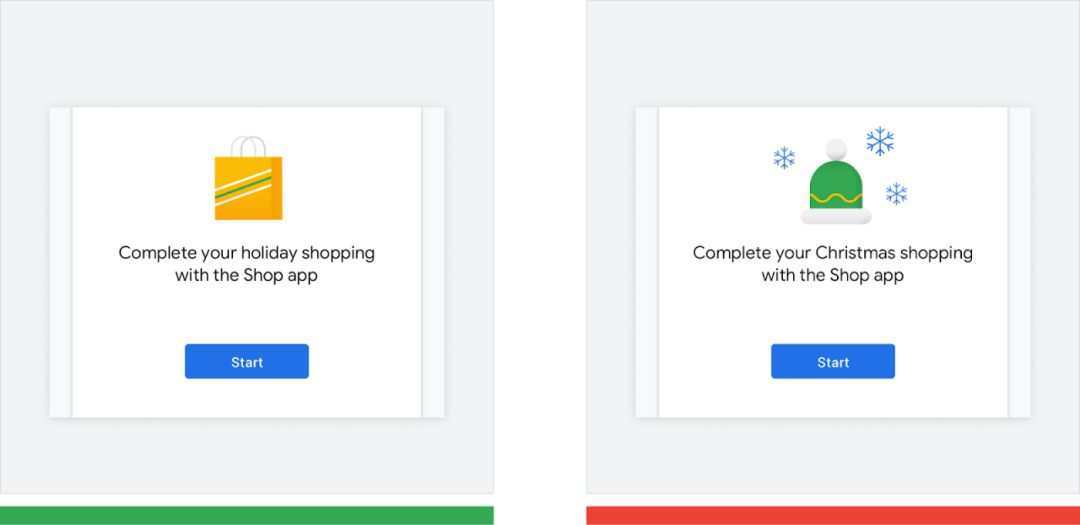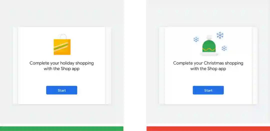 错误做法 (红色): "圣诞购物" 并不是全球性示例。不是所有的国家/地区和文化都庆祝圣诞节。