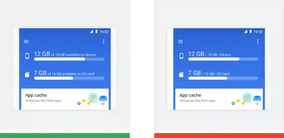 △ 正确做法 (绿色): 长句可清楚说明设备上还剩多少可用的存储空间。