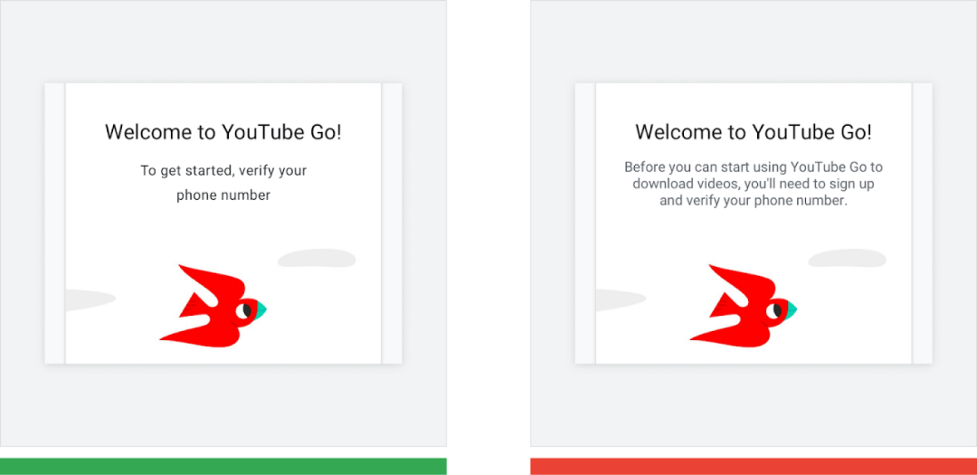 △ 正确做法 (绿色): 欢迎词下面附有简洁的介绍性短语。