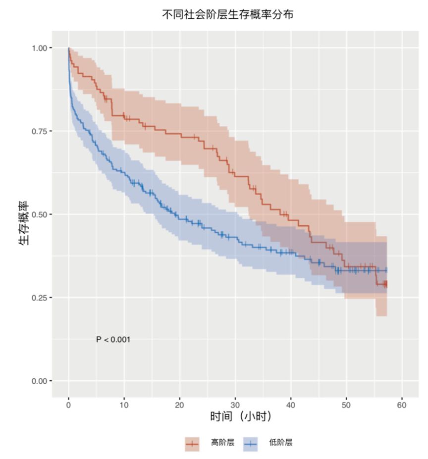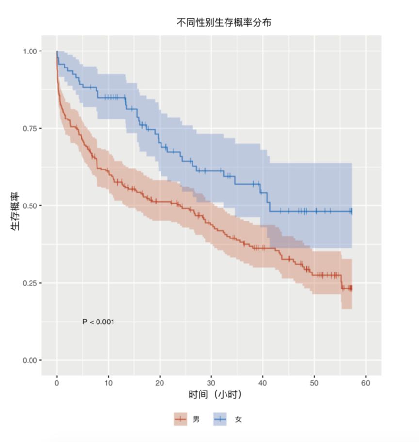 从性别来看,男性的生存时间中位数显著的少于女性(24.0小时<41.3小时, P<0.001),与男性相比,女性的死亡概率要低20%。