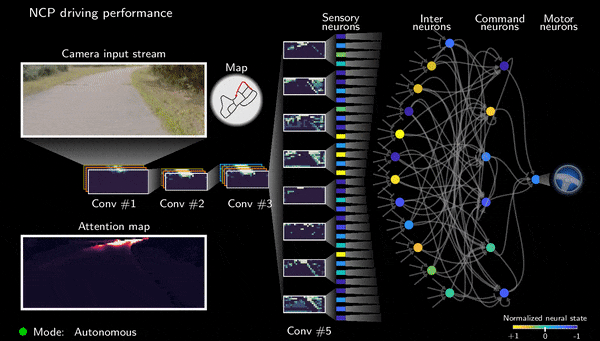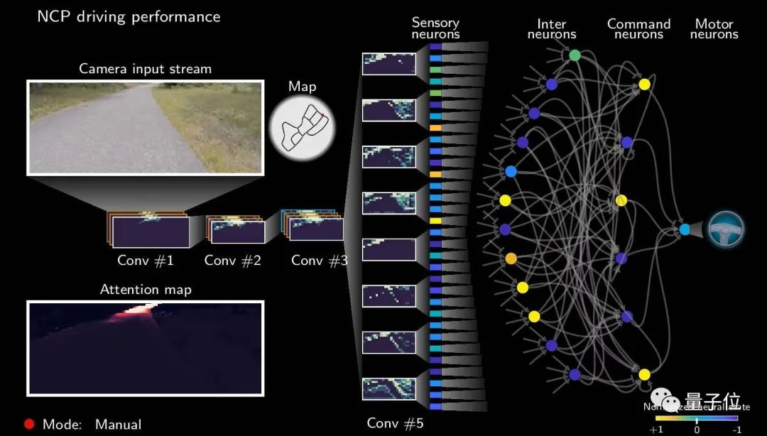 后面的神经网络来确定摄像机图像的哪些部分重要,然后将信号传递到网络的NCP控制系统。