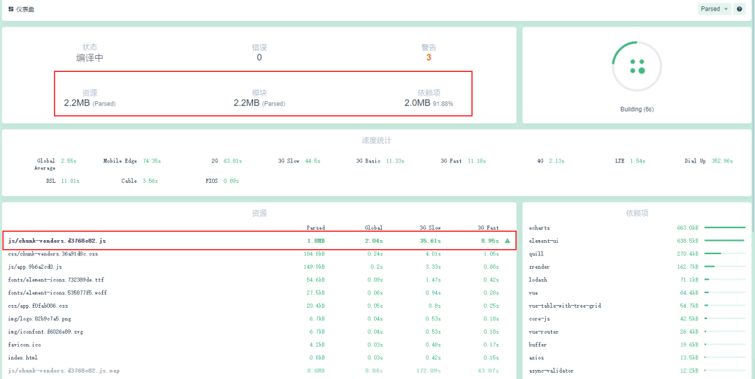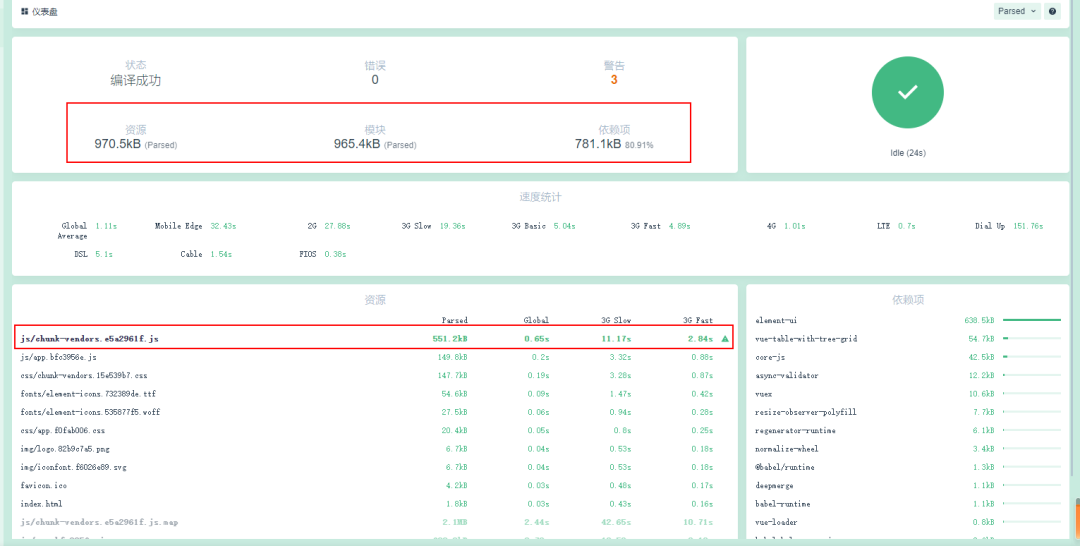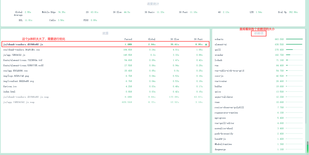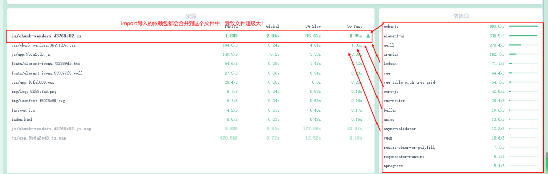 上边图片中标注的就是我们需要注意的,依赖项很多,导致打的包最终体积非常的大,相信这项目如果上线那么前端会先请求这个无比巨大的js文件,估计甲方爸爸会锤死前端人员。