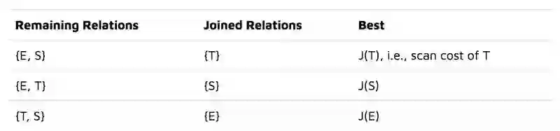 这个算法遍历其他二元关系集,最终找到连接所有三张表的最佳成本。这需要在二元关系和基本关系的所有可能“left-deep”组合中取最小值: