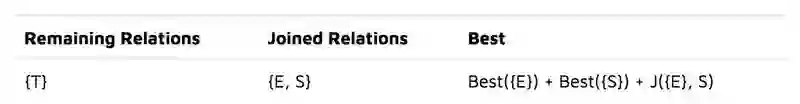 然后,它基于这些信息枚举所有二元关系。例如,在计算{E,S}连接的最佳成本时,它会查找先前相关的计算结果: