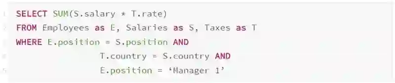 假设一个数据库包含三张表:Employees、Salaries 和 Taxes。下面这个查询用于找出“所有 Manager 1 员工的总税额”: