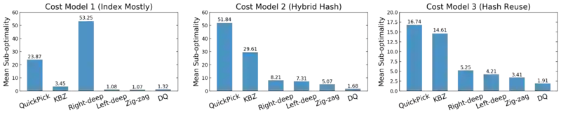 比较。我们与几个启发式优化器(QuickPick 和 KBZ)以及经典动态规划(left-deep、right-deep、zig-zag)进行比较。我们对每个优化器生成的计划进行评分,并与最优计划(我们通过穷举获得)进行比较。