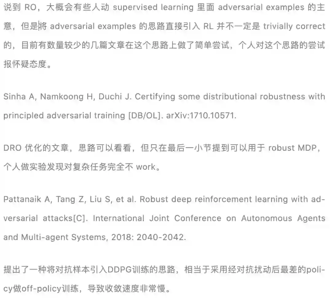 学术界中,robust optimization(以下简称 RO)是一个比较容易想到的解决方案,在早期 RL 研究者们还聚焦于各种 MDP 数学意义上的 tractability 的时候,就已经有一些工作研究在不完美、或者包含 uncertainty 的环境动态的基础上进行优化,这种优化一般被称作 robust MDP。