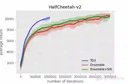 环境复杂度的问题会进一步提升训练的复杂度:加入环境随机化后,模型训练达到收敛所需的样本量实际上也显著上升了,由于其他论文里都不怎么提,这里以TD3为 baseline放一点点自己的实验图作为证据(忽略绿色曲线),这里可以看到HalfCheetah-v2环境上,加入了环境随机的模型用了大约三倍的 iteration 才达到了原始版本TD3的水平。