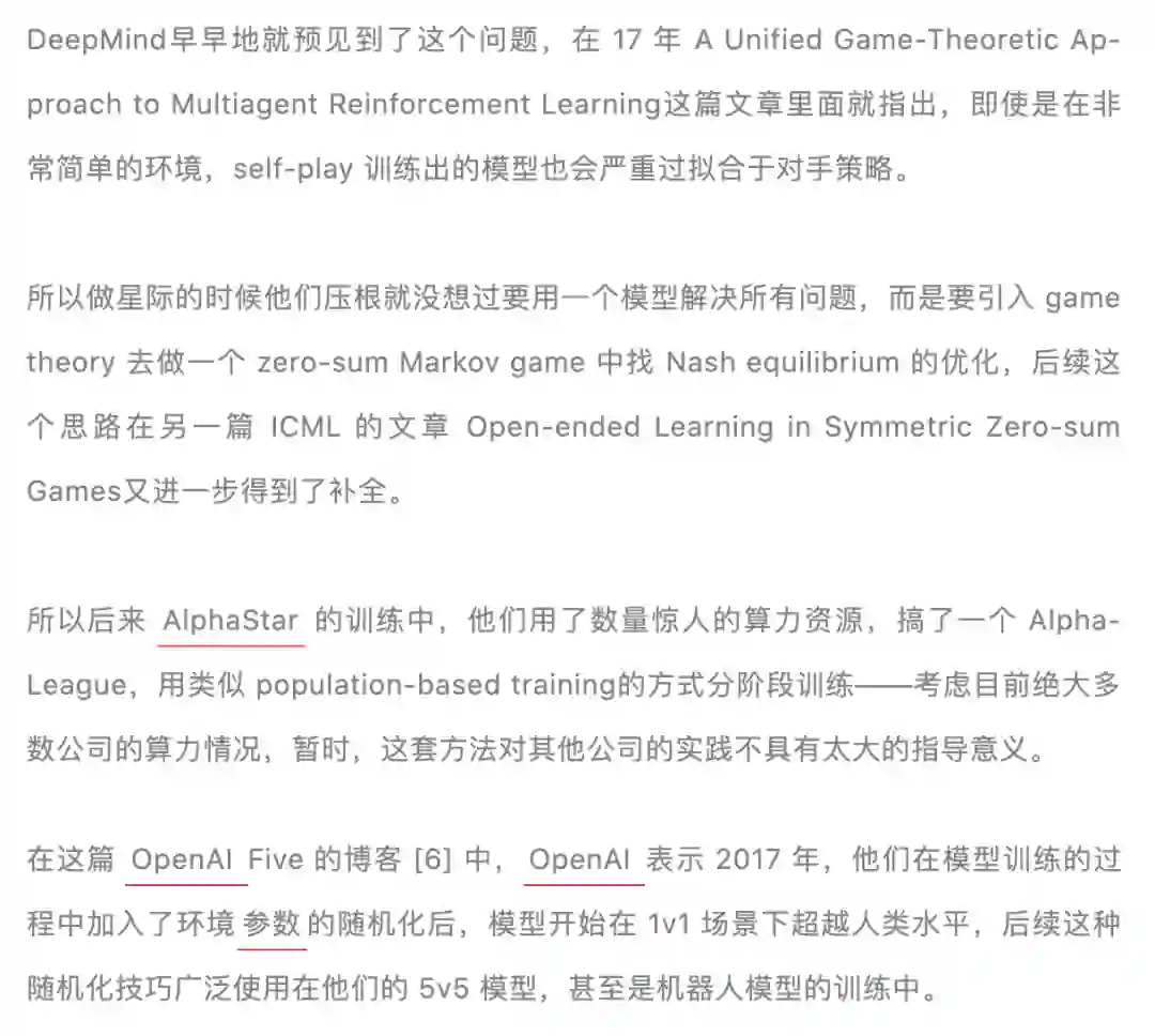 案例一,众所周知DeepMind和OpenAI都做游戏 AI,一个做星际一个做Dota,为了训练出一个超过人类水平的 AI,两家共同的思路就是 self-play,但是实际上 self-play 会遇到训练时过拟合于对手策略的问题,因为实际部署时会遇到各种各样奇葩的对手策略,训练时从来没有见过奇葩对手的模型会严重翻车。