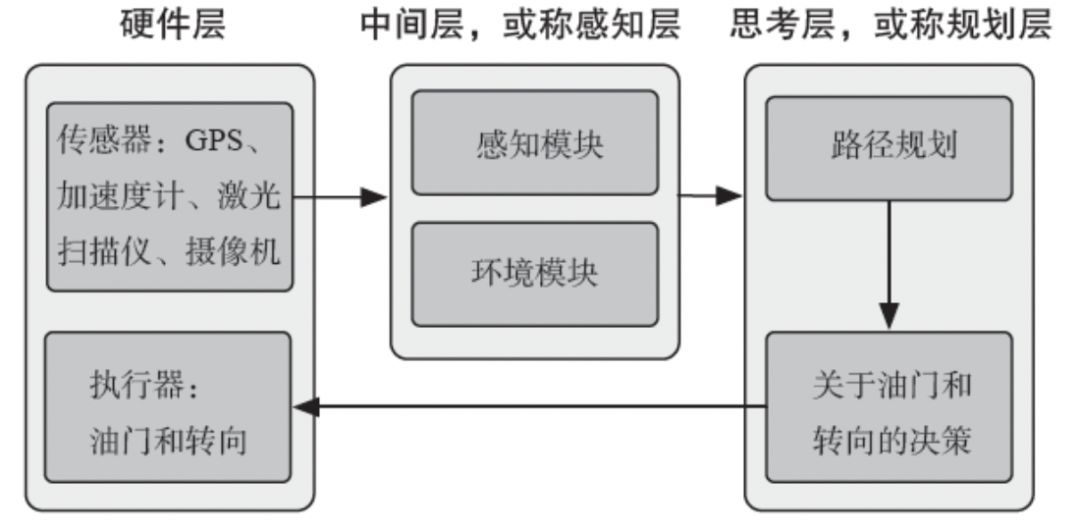 架构最左侧的部分是硬件层,其中包括传感器和执行器,前者负责收集数据,后者控制转向、刹车和发动机转速。