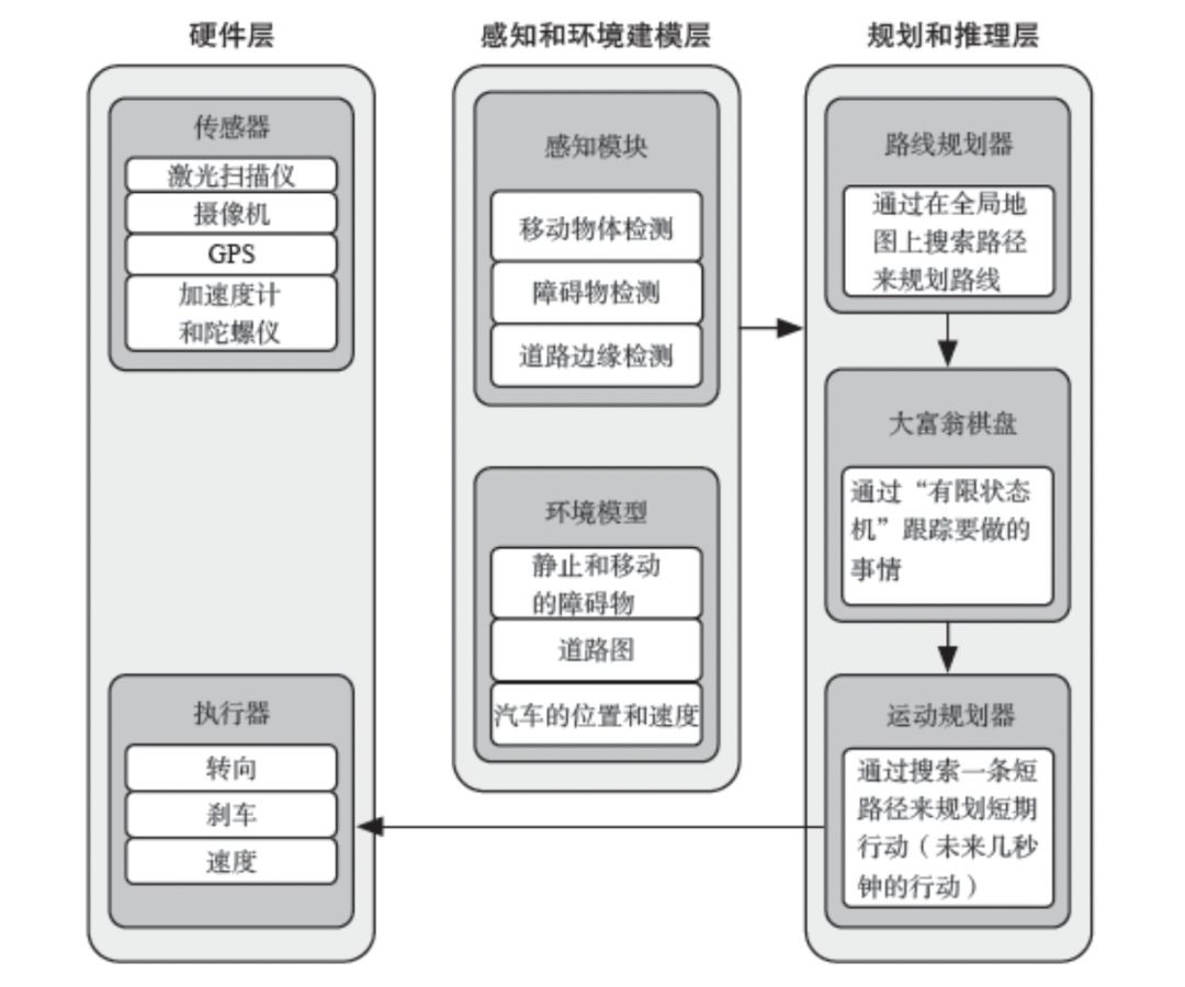 在另一端,即最右边,是思考层,或称规划层:它执行汽车的高层次规划。鉴于道路上有障碍,这一层解决了汽车应该如何转向以避开障碍的问题。这一层负责决定汽车的实际驾驶方式。它将命令发送到最左边的硬件层。