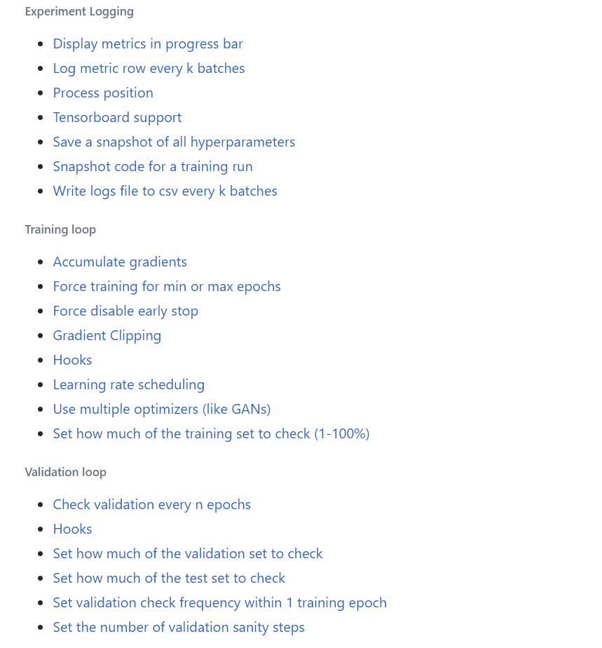 # what to do in the training loopdef training_step(self, data_batch, batch_nb):# what to do in the validation loopdef validation_step(self, data_batch, batch_nb):# how to aggregate validation_step outputsdef validation_end(self, outputs):# and your dataloadersdef tng_dataloader():def val_dataloader():def test_dataloader():