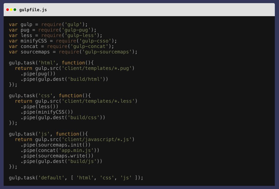 开头定义一个 task 叫做 html,是来把 pug 档案转换成 html,第二个 task 叫做 css,用 less 转换之后再 minify;第三个则是把 js 产生 sourcemap。只要你一打 gulp 这个指令,就会自动帮你执行上面三个 task。