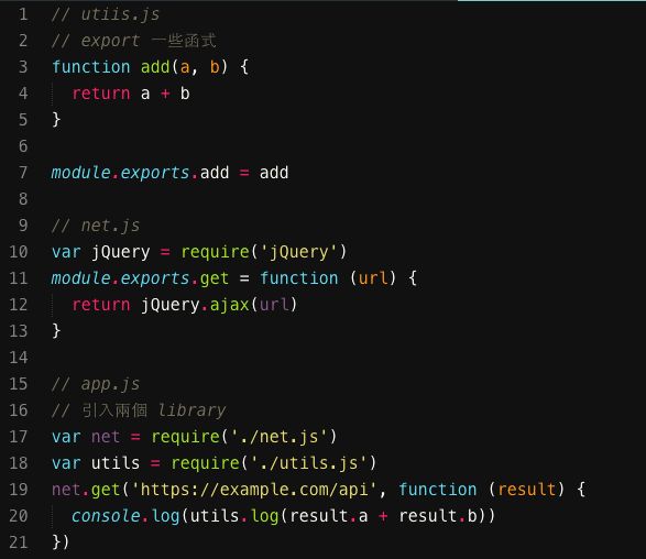 现在你可以直接在代码裡面写:var A = require(‘libraryA’) 去引入一个 library,而不是用 <script/> 标签去引入。而背后的原理就是靠着browserify 去帮你实作 require 这个函式,自动帮你处理好背后的相依性问题。