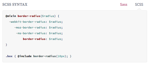 还记得之前提过需要针对不同浏览器去调整 CSS 吗?有些必须要加 prefix 才能运作。这点用预处理器也能够很轻松地去解决,用一种叫做 mixin 的东西,你就想成是 function 就好: