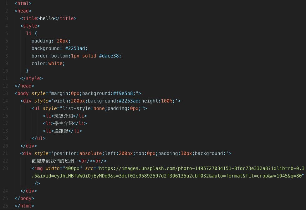 举例来说,<li>就是 list item 的意思,而标签里面放的就是你的内容。至于 style 则是人如其名,负责管理所有跟样式有关的操作,background 就是背景,color 就是文字颜色。