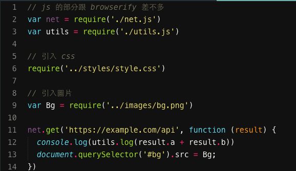 webpack 用起来其实跟 browserify 很像,差别在于前者把更多东西都视为是资源,所以写出来的代码会像这样: