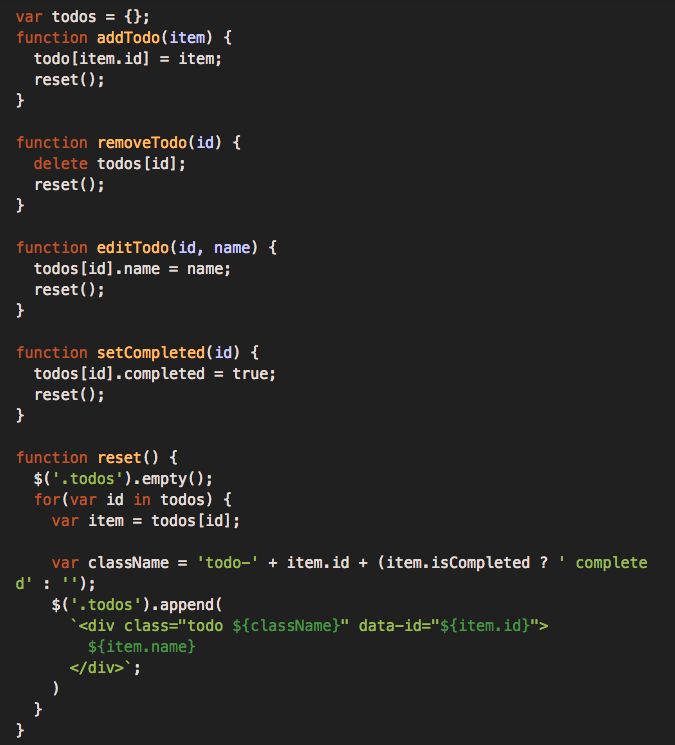 你要删除 todo,你直接删除 state 的 todo,不用管网页上的元件。你要新增也是一样,完全不用管画面上的东西,因为只要 state 一改变,整个 UI 就会改变。以这个概念来实作的话,大概会变成这样: