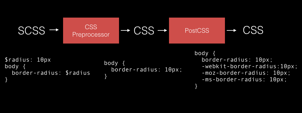 在这边你要知道 PostCSS 跟 CSS preprocessor 的差别在哪,前者的 input 是 CSS,output 是加上了 prefix 之后的 CSS;后者的 input 是 SCSS(或其他),output 是 CSS。你甚至可以把两者合在一起用:
