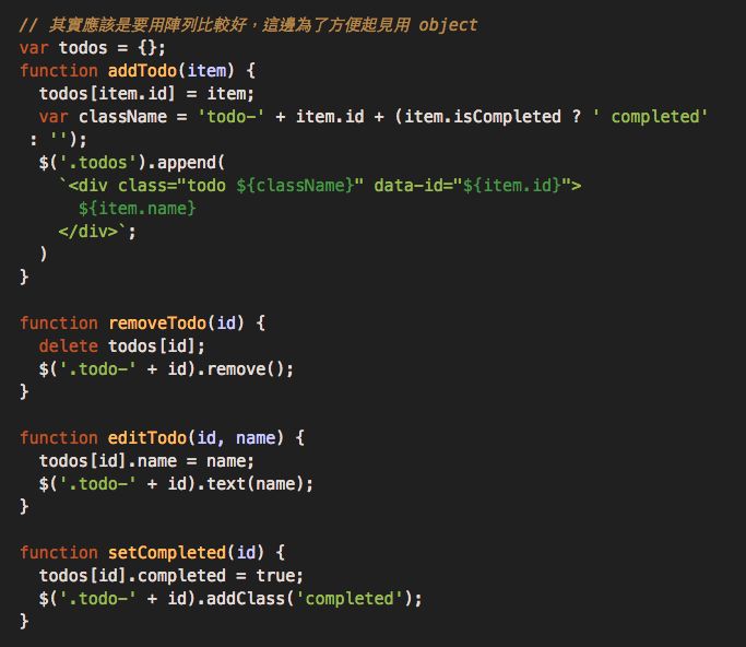 难吗?乍看之下没那麽难,我们可以写出以下的程式码,在操作 todo 的时候同时操作 UI 以及内部的状态: