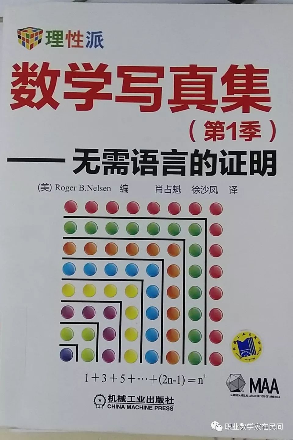这是一套(2本)非常非常优美的数学书,书中展示了大量的数学定理,代数或三角公式,不等式,组合恒等式,其中大部分都是中学的数学知识。所有的这些数学知识都是用几何的办法来证明,正如书名所示,每个证明都没有文字,只是一副几何或组合图,比如封面就是一个恒等式的组合证明。正是这一副图就可以告诉你为什么这些定理,公式,不等式是对的。可以说这本书展示了数学非常直观的一面。甚至您看完后可能会怀疑是不是每个数学知识背后都有一个几何背景。如果数学老师在课堂上用这种风格来讲数学知识,何愁学生不喜欢数学。不过也不是每个图形证明都容易看懂,积极的读者可以挑战一下,看看自己能看懂多少个图形证明。