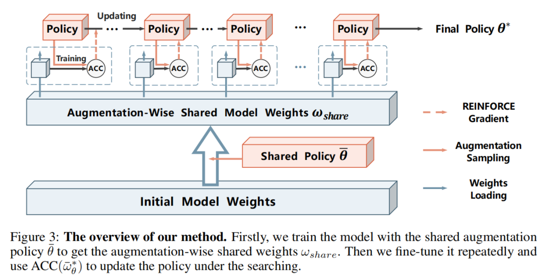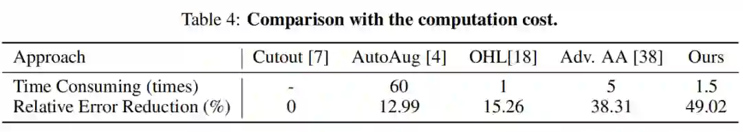 由于第一个part中共享的增强训练独立于给定的策略冗余,对于所有候选的增强策略只需训练一次就可以进行搜索,大大加快了优化速度。