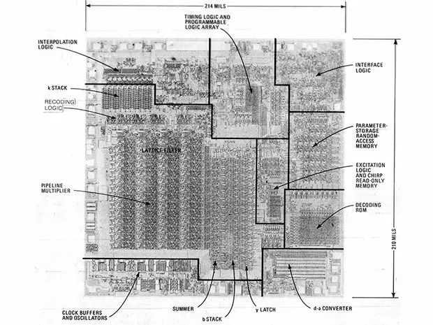 TMC0281于1978年发布,使用被称为线性预测编码(linear predictive coding,LPC)的技术产生语音,所产生的声音是一些嗡嗡声、嘶嘶声和爆裂声的组合。对于“产生语音”这件被认为是“不可能在集成电路中实现的”的事情,这是一个令人惊讶的解决方案。