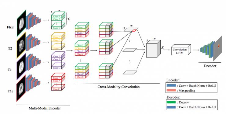 3D医学图像的切割是医学图像处理里一个非常重要的工作,比如脑部MRI数据、肺CT数据和X光数据等等。现在大多数的3D医学图像分割方法都只用了一个形态或把多个形态堆起来变成不同的通道,该工作中提出了一个包含交叉形态卷积层(cross-modality convolution layer)的深度编码-解码的网络结构(deep encoder-decoder structure)来合并核磁共振的不同形态,还利用卷积LSTM来对2D切片序列建模,并且把多形态卷积和LSTM网络结合在一起,做到端到端的学习。为了防止收敛到某一特定的类,论文中使用了权重策略和two-stage训练来处理类不均匀的情况。