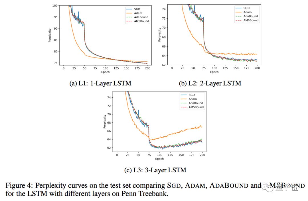在LSTM上的实验则证明Adam更好的泛化能力。Adam算法在该实验条件下没有收敛到最优解,而AdaBound和SGD算法一样收敛到最优解。