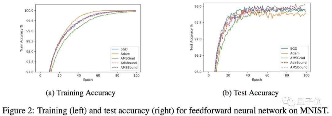 在这种情况下,AdaBound开始时就像Adam一样训练速度很快,随着学习率边界越来越受到限制,它又逐渐转变为SGD。
