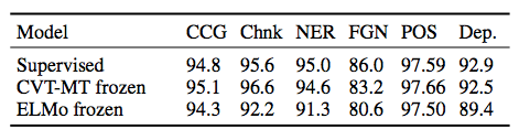 表 4:单任务模型在开发集上的性能对比。CVT-MT frozen 表示我们在五个任务上预训练了 CVT + 多任务模型,然后在第六个任务上仅训练预测模块。ELMo frozen 表示我们基于 ELMo 嵌入训练预测模块(不包括 LSTM)。