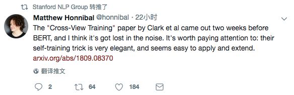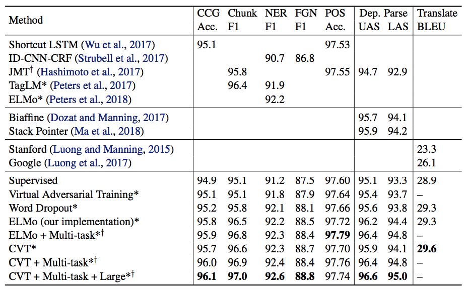 在 BERT 论文出现的几周前,斯坦福大学和谷歌大脑合作的一篇同样关于 NLP 预训练模型的论文发布。该研究提出一种新型自训练算法 Cross-View Training (CVT),结合预训练词向量和自训练算法,使用标注数据和无标注数据的混合,从而改善 Bi-LSTM 句子编码器的表征,进而改善整个模型。此外,CVT 与多任务学习结合起来后效果尤为显著。