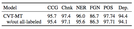 表 2:有/没有适用所有任务的标注数据时,多任务 CVT 的开发集性能。