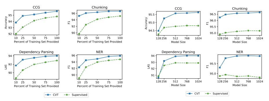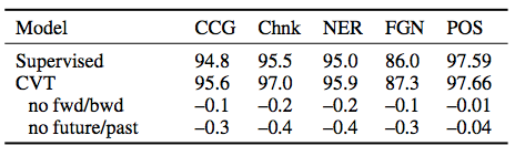 CVT 的作用在于改善模型的表征学习。辅助预测模块可以从整个模型的预测中学习,因为整个模型具备更好、视角不受限的输入。尽管辅助模块的输入对应受限视角的输入样本,但它们仍然能够学习作出正确的预测,因此能够改进表征的质量。这反过来改善了整个模型,因为它们使用的是同样的表征。简而言之,该方法将在无标注数据上进行表征学习与传统的自训练方法结合了起来。
